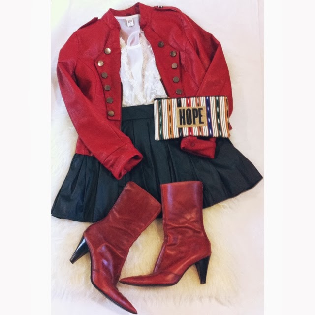 Love the red jacket and pleated skirt! Very nice combo